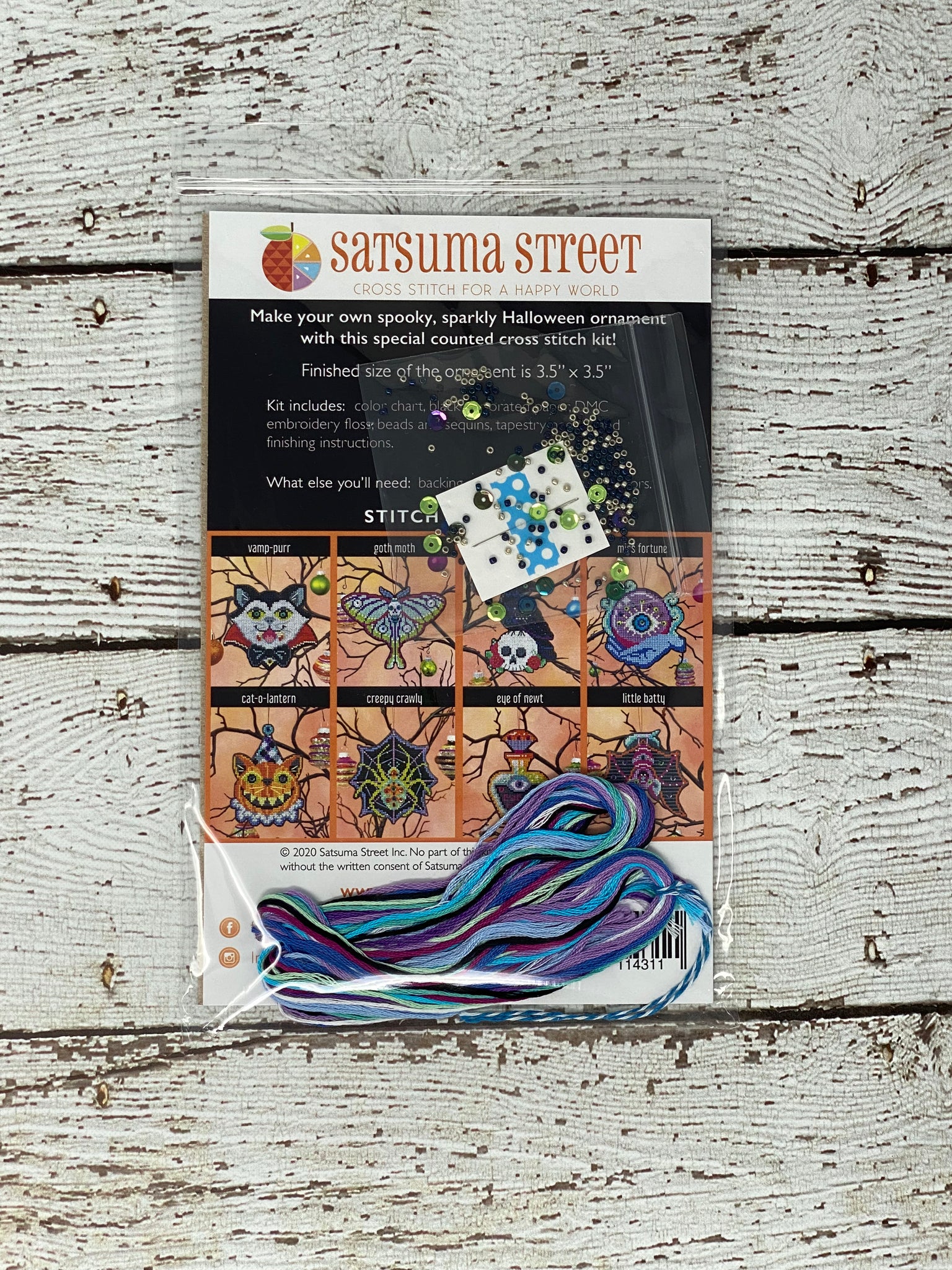 Kit includes everything you need - pattern, DMC, beads/sequins, tapestry needle & perforated paper. Also includes finishing instructions.