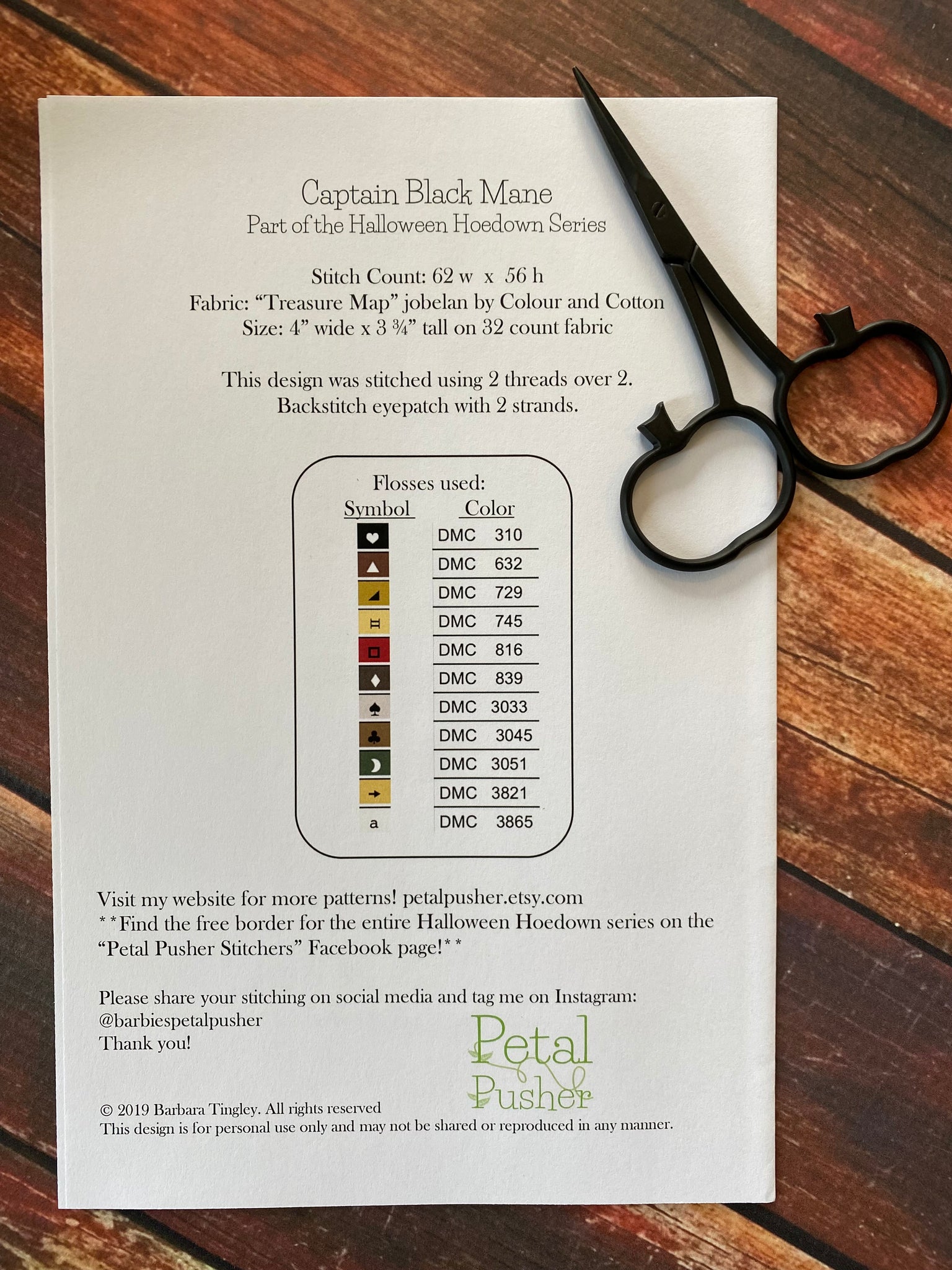 Captain Black Mane | Halloween Hoedown Series | Petal Pusher *Please check out the picture of the back of the pattern to get model info and floss needed.