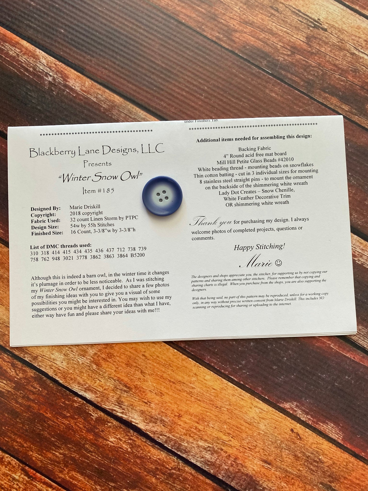 Winter Snow Owl | Blackberry Lane Designs *Please check out the picture of the back of the pattern to get model info and floss needed.